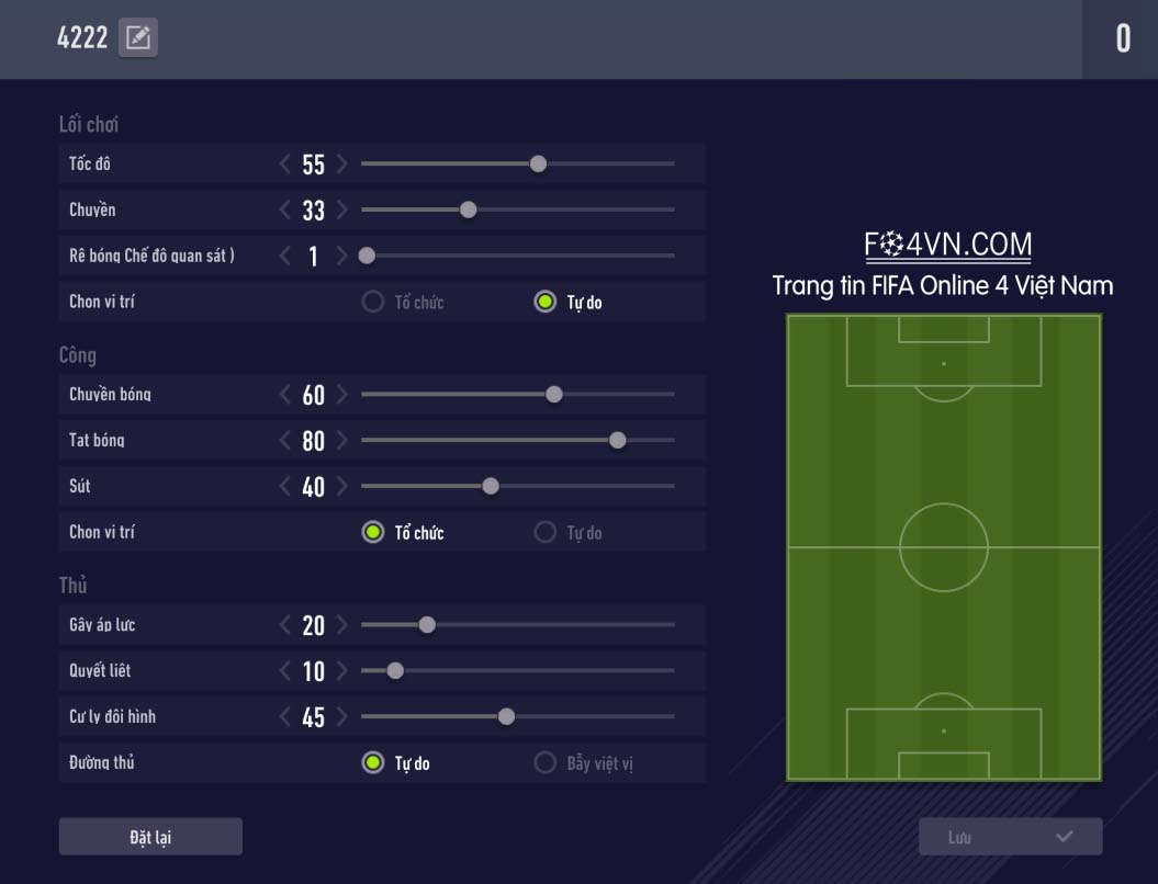 Chọn lối chơi với tốc độ khá cao, có thể nhận ra đây là phương án phòng ngự phản công và phát động tấn công với các đường mở bóng ra 2 biên, hai tiền đạo của bạn ở trong, hãy là những cầu thủ có tốc độ và khả năng chơi đầu tốt. Trong khi đó với áp lực và độ quyết liệt gần như hạ về thấp nhất, sẽ giúp cho đội hình phòng ngự sẽ không dâng cao, hay áp sát quá nhanh đối phương, mà chọn lối chơi bắt bài che chắn. Với meta hiện tại, đừng vội vàng trong cản phá. khóa chặt trung lộ để tránh đối phương có thời cơ sút xa, bạn sẽ giảm được bàn thua rất nhiều.