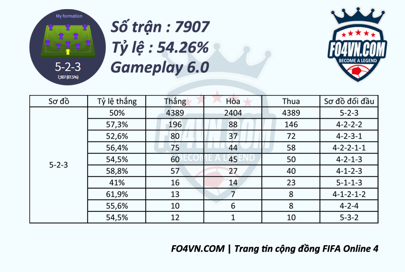 Mỗi lần thay đổi meta game là một lần những nhà HLV lại mày mò tìm hiểu một sơ đồ xem nó có phù hợp với meta của game hay không? Ở chế độ 1vs1 thì sơ đồ 4222 đang làm mưa làm gió nhưng không phải tuyệt đối. Ngược lại 5-2-3 lại chiếm tới 97% trước update. Còn hiện tại thì sao