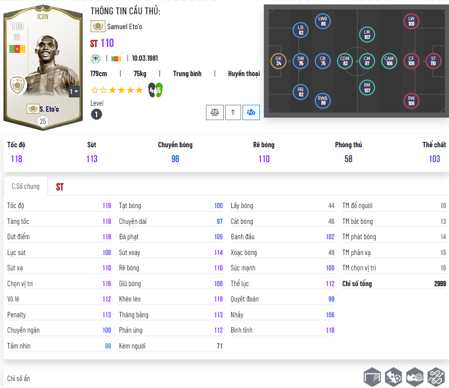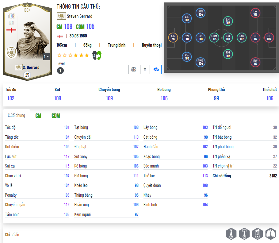 Có lẽ điều bạn cảm thấy lạ lẫm đầu tiên chính là việc Gerrard ICON có chỉ số thăng bằng và khéo léo quá thấp so với thực tế ngoài đời của số 8 huyền thoại này. Chưa kể là hai chân của mùa ICON chỉ là 3/5 ngang ngửa mùa giải TC ra đời cách đây 4 năm, trong khi các mùa khác đều được 4/5. Với thời đại nhìn chân thuận chân nghịch để chọn cầu thủ như hiện nay thì rõ ràng chân 3 của Gerrard là khá tệ.