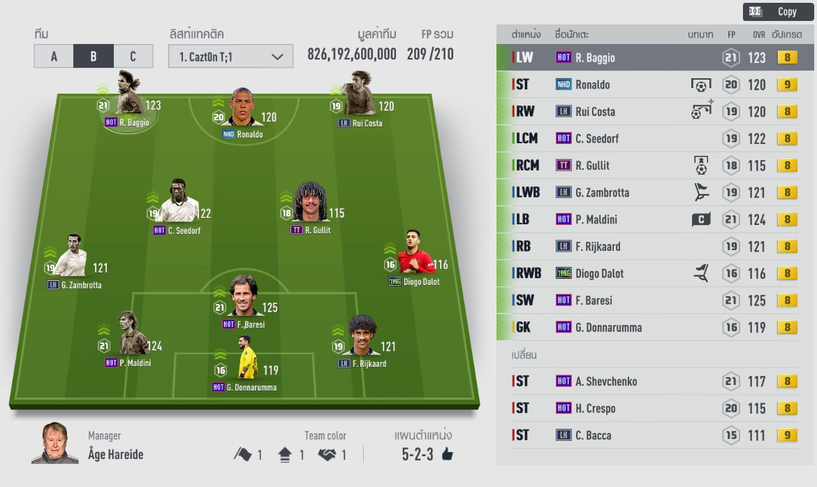 Đây là đội hình có thể nói là cực đẹp chỉ riêng mặt hình thức với full các cầu thủ + 8 đã làm người chơi thỏa mãn được yếu tố xây dựng đội hình toàn "vàng"