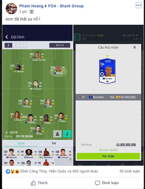 Mới đây thì thẻ Ronaldo TC +8 đã được một đại gia mua lại với giá 43 tỷ BP và số tiền bù thêm lên tới con số 120 triệu VND. Được biết danh tính của vị đại gia này là Eric Mun. Vị đại gia chịu chơi số một của làng FIFA Online từ phiên bản 3 đến 4.