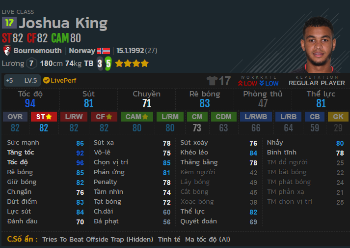 Tốc độ tốt và khả năng chạy xẻ nách rất thông minh. Dứt điểm tốt, bóng đi căng và hiểm. Thể chất rất ổn với 1 tiền đạo chạy nhanh.