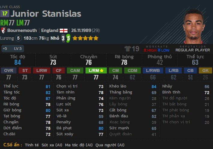 Tốc độ ở mức ổn, rê dắt ổn. Xu hướng 3-1 khá thực trong game khi Stanislas thường xuyên có những pha dâng cao khi tấn công. Tuy nhiên điểm yếu của cầu thủ này là ở sức mạnh thể chất không cao, dễ bị đẩy ngã nếu so kè 1 vs 1