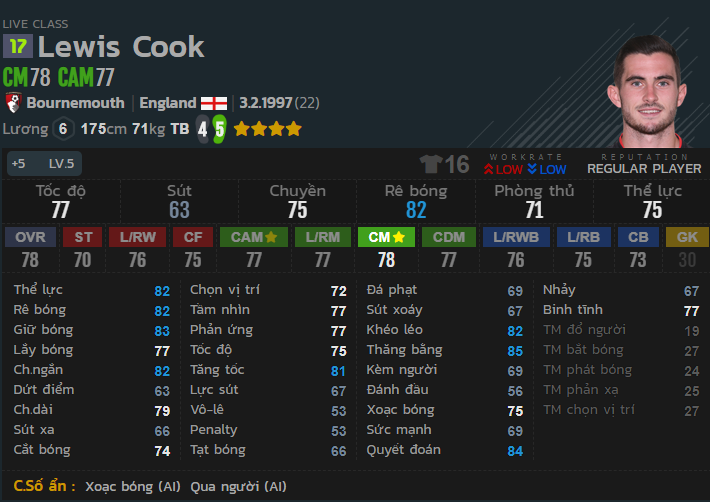 Tốc độ ở mức ổn, khả năng phòng ngự ổn. Điểm mạnh của L.Cook trong game là ở khả năng kiểm soát bóng và thu hồi bóng tốt trên sân. Ngoài ra khả năng chọc chân lấy bóng của L.Cook cũng là khá hay.