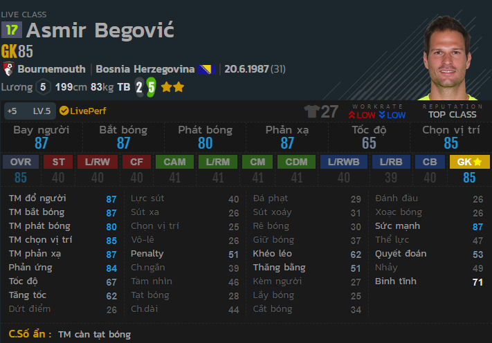 Với tài năng được thể hiện vô cùng xuất sắc trong ingame tại giải vô địch FIFA Online 4 Việt Nam vừa qua, có thể thấy Begovic là vị trí không thể thay thế trong khung gỗ.