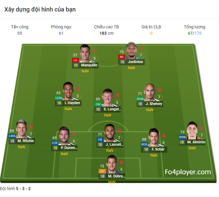 Newcastle United: Martin Dubravka; Javier Manquillo, Fabian Schar, Jamaal Lascelles, Paul Dummett; Matt Ritchie, Jonjo Shelvey, Isaac Hayden, Sean Longstaff; Miguel Almiron, Joelinton.