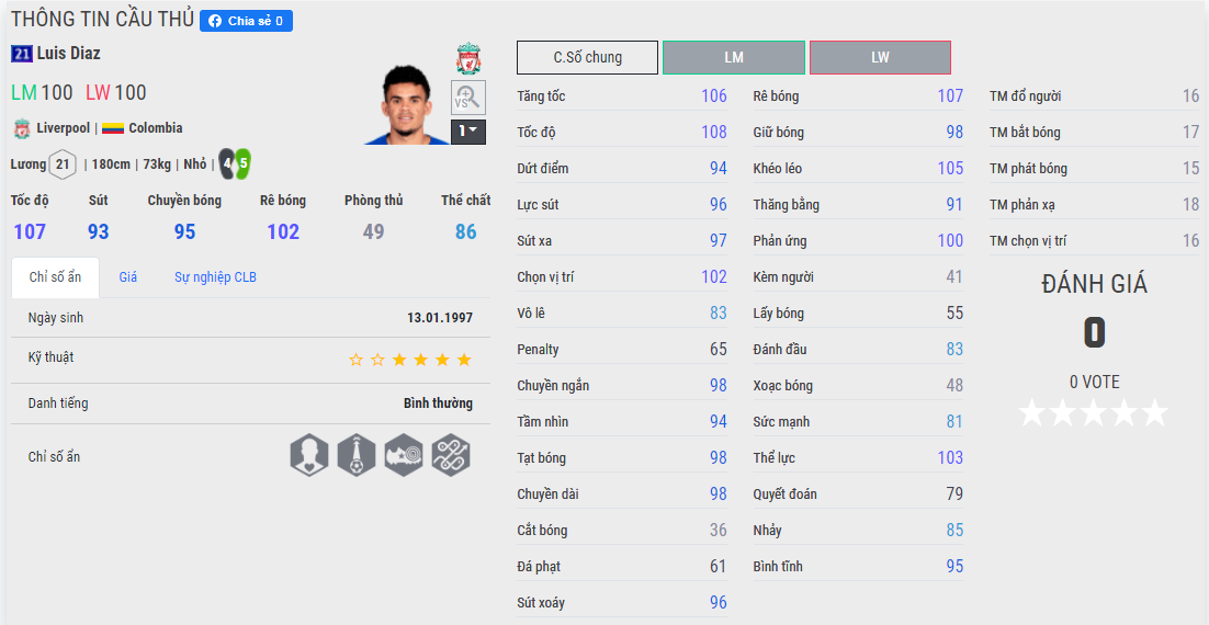 Với bộ chỉ số khá ấn tượng, tốc độ của cầu thủ chạy cánh này là cực tốt với mức thẻ hiện tại.