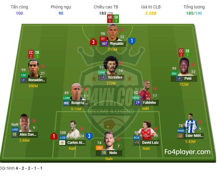 Cùng với Hà Lan, Pháp thì Brazil đang là đội tuyển có nhiều huyền thoại ICON nhất trong game. Tuy nhiên rất khó có thể nhồi nhét hết tất cả vào một đội hình do giới hạn mức lương là không thể đủ. Chúng tôi xin gửi tới các bạn sơ đồ do chúng tôi đề xuất. Vừa có các huyền thoại vừa đảm bảo trong thi đấu ranking. Mong rằng sẽ nhận được sự góp ý của quý độc giả