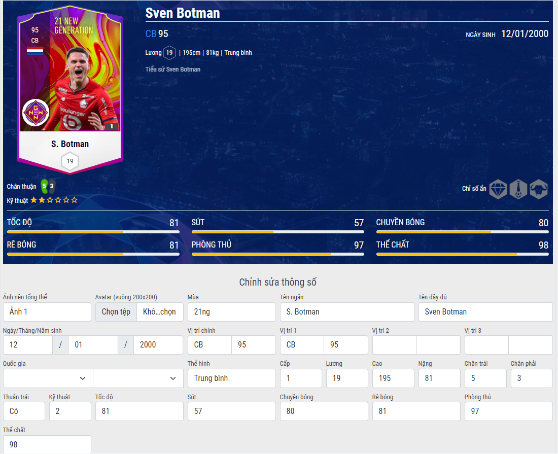 Hôm nay Fo4s.com đã ra mắt tính năng mới khá thú vị dành cho những bạn thích nghịch ngợm hay chỉ đơn giản là " ngắm một mình" đó chính là tạo ra thẻ cầu thủ theo ý thích của mình