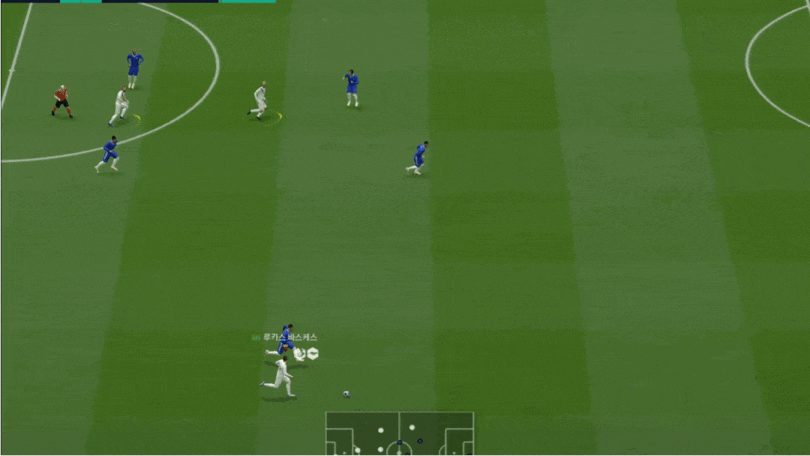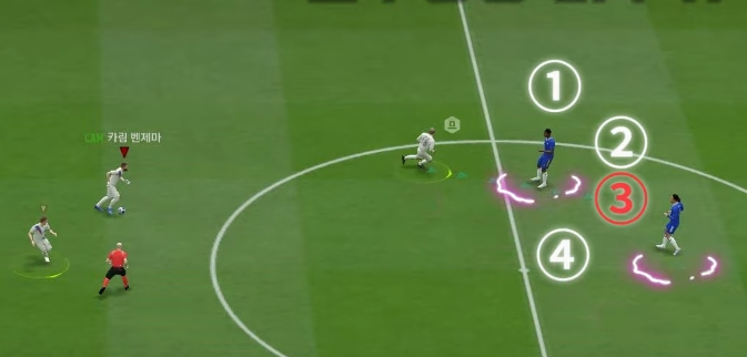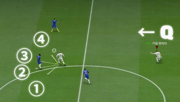 Ở lần nháy Q đầu tiên, anh ta đã chọn nháy Q và phím số 3 để tạo ra một hướng xâm nhập về phía trung vệ đứng thấp nhất, điều này sẽ thu hút sự chú ý của trung vệ đừng gần đó, thông thường người chơi sẽ đổi chỏ sang trung vệ đứng sau để thực hiện pha bọc lót ( cái này là thói quen và nguyên tắc phòng ngự )
