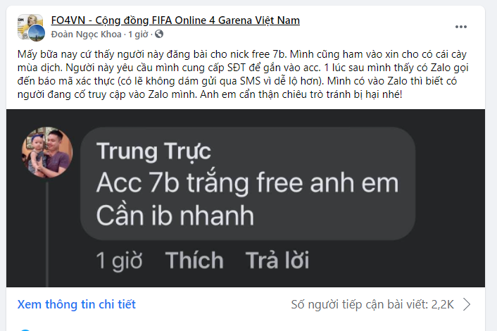Chiêu trò của kẻ này là đăng thông tin chán game muốn cho ai free acc của mình. Rất nhiều anh em " tham của rẻ, của free" inbox cho hắn để xin thông tin. Kẻ lừa đảo lúc này sẽ yêu cầu người xin đưa cho hắn số điện thoại để hắn add số điện thoại vào tài khoản mang đi cho ( thực tế chẳng có tài khoản nào cả ". Thông thường người đi xin sẽ đưa số điện thoại cá nhân hay người thân. Và đây chính là yếu tố lộ thông tin cá nhân của bạn. Kẻ lừa đảo sẽ dùng nó để tìm cách truy cập các ứng dụng sử dụng số điện thoại như Momo hay Zalo.