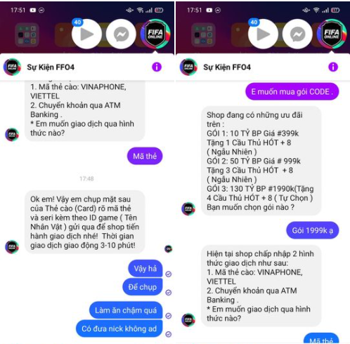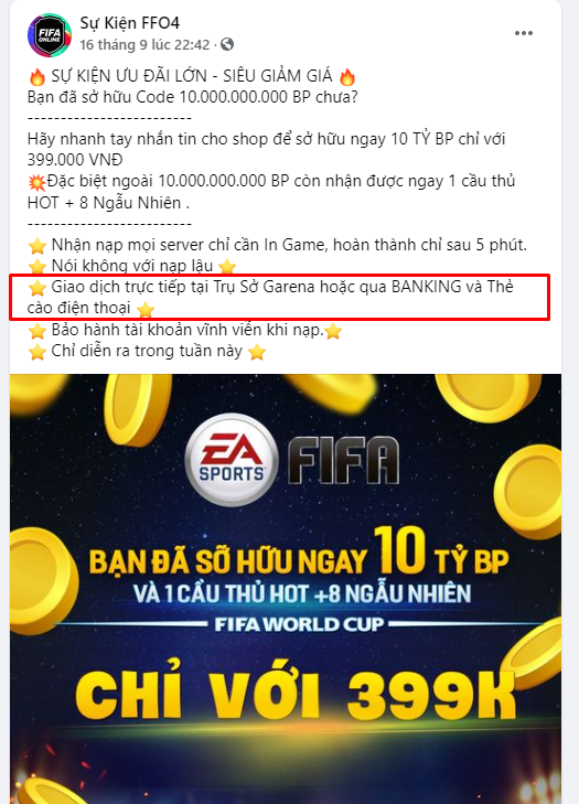 Đầu tiên là vụ nạp 399k mà được sở hữu 10 tỷ BP và một thẻ mùa HOT +8. Đáng chú ý là còn giao dịch trực tiếp tại chủ sở Garena, bức hình thì được chỉ sửa logo từ phiên bản FIFA 15. Có lẽ những kẻ lừa đảo quên mất một điều là chả có ông Garena nào giao dịch tại trụ sở cả.