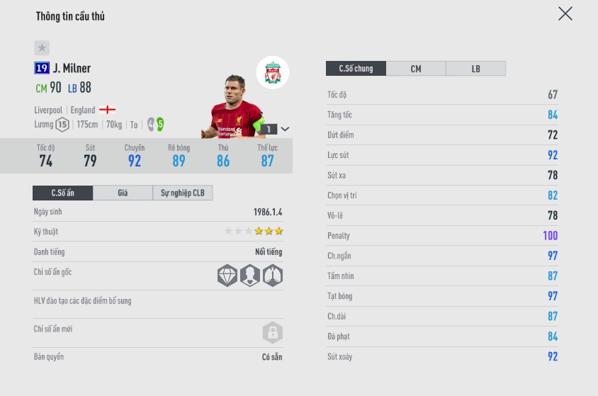 Đầu tiên chúng ta sẽ lấy James Milner 19UCL làm ví dụ.