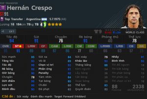 Van Basten TT với thằng bằng 76Nếu các bạn đã từng sử dụng qua 2 tiền đạo này, đều dễ nhận ra, Crespo rê bóng mượt mà hơn hẳn so với Van Basten, dù chỉ số rê bóng, giữ bóng của cả 2 là gần như tương đương. rất khó lấy bóng trong chân Crespo TT. Tiền đạo người Argentina đi bóng, đội hướng bóng rất nhanh. Trái ngược là một Basten nhìn khá thô thiển khi đổi hướng bóng. Điều quyết định ở đây là gì ? đó chính là sự thăng bằng khi quay người, đảo người của cầu thủ. Nó sẽ làm cho động tác của cầu thủ đó có chắc chắn hay không ? Basten chạy thẳng thì khá tốt, nhưng cứ quay người đảo bóng, đảo hướng là đối phương luôn ập vào lấy bóng rất dễ dàng.