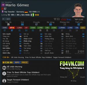 Tiền đạo chân gỗ Mario GomezNhư trong hình là tiền đạo Mario Gomez với các chỉ số lần lượt : tốc độ 79, sút 88, chuyền 67, rê bóng 80, phòng thủ 34, thể chất 82.