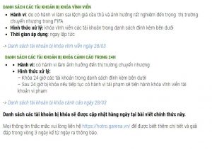 Sau hơn 2 tháng im hơi lặng tiếng, thì tối ngày 28/3/2019 Garena FIFA Online 4 Việt Nam bất ngờ thông báo danh sách khóa những tài khoản vi phạm chính sách đẩy giá cầu thủ của mình. Cụ thể trong bảng danh sách này chia làm 2 loại. Khóa vĩnh viễn và khóa cảnh cáo.