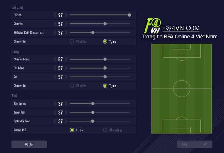 * LWB, RWB : bạn nên để xu hướng phòng ngự là 1/3. Nhằm tránh AI của 2 cầu thủ này tự động dâng quá cao trong các tình huống tấn công. Nếu như bạn muốn hậu vệ cánh dâng lên bạn chỉ cần thực hiện thao tác chồng cánh là được.