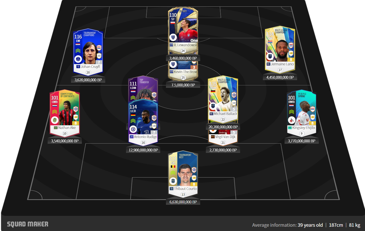 Đội hình khá hỗn tạp tuy nhiên có thể nhận ra những cái tên đến từ Hà Lan và Chelsea. Tiền vệ tấn công trong sơ đồ này là Bruyne 21TY