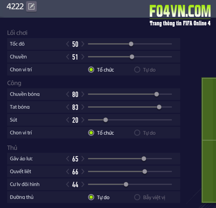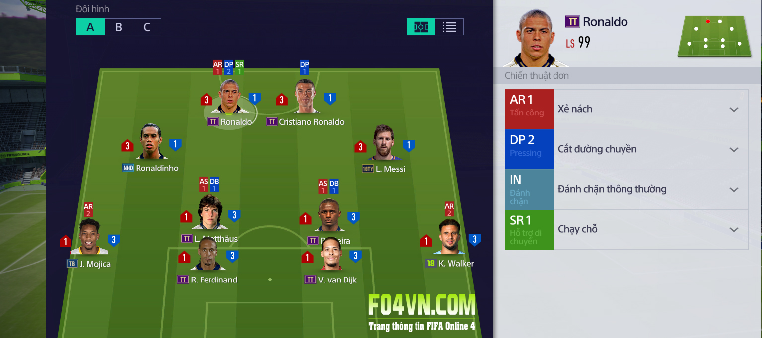 4-2-2-2 với những cái tên quốc dânĐiều đặc biệt trong cách sử dụng cặp tiền vệ phòng ngự là chiến thuật đơn để cắt bóng chứ không đơn thuần là không tấn công. Trong khi đó thì cặp tiền đạo phù hợp nhất với gameplay hiện nay là " Song Rô " lại thả tự do cho Cr7 khi chỉ yêu cầu cầu thủ này tham gia đoạt lại bóng trong chân đối phương. Một hàng phòng ngự 4 người, nhưng cặp trung vệ Ferdinand và Van Dijk cũng không có sự trói buộc nào, khi để ở chế độ thông thường. Chiến thuật đội của 4-2-2-2