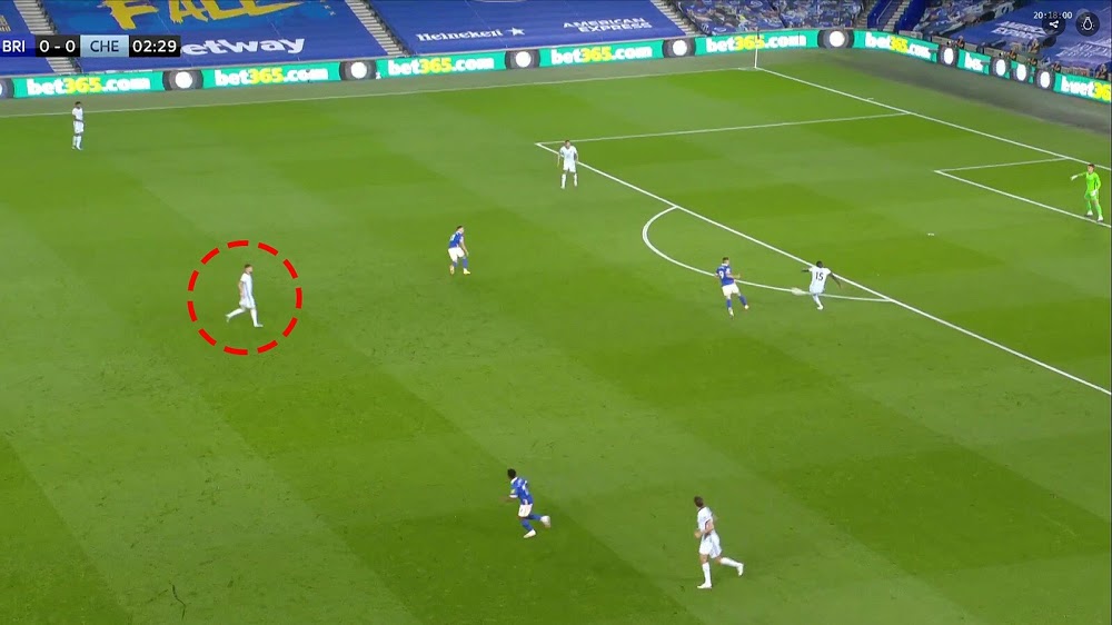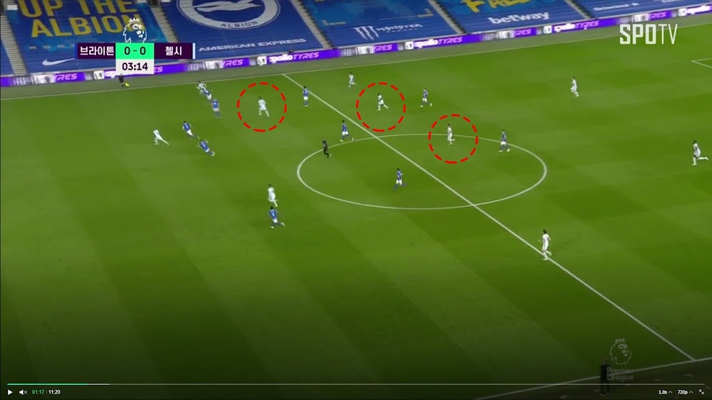 Thật ra khi bắt đầu trận bóng này, ý đồ của Lampard là đá 433 áp đặt lối chơi lên đối thủ. Với việc kéo Jorinho lùi khá sâu nhận bóng. Tuy nhiên bên phía Bringhton liên tục đá áp sát, buộc Chelsea phải dồn bóng ra biên nhiều hơn và chiến thuật của Chelsea lại chuyển dần sang 442. Phía Bringhton tiếp tục đua thể lực khi tạo sức ép cực lớn vào 2 bên hành lang cánh của Chelsea. Và họ đã có được bàn thắng gỡ hòa ở phút thứ 54. Cũng từ đây, Chelsea chuyển sang đá 4231 với ý đồ chiếm giữ khu vực trung tuyến, kiểm soát bóng nhiều hơn.