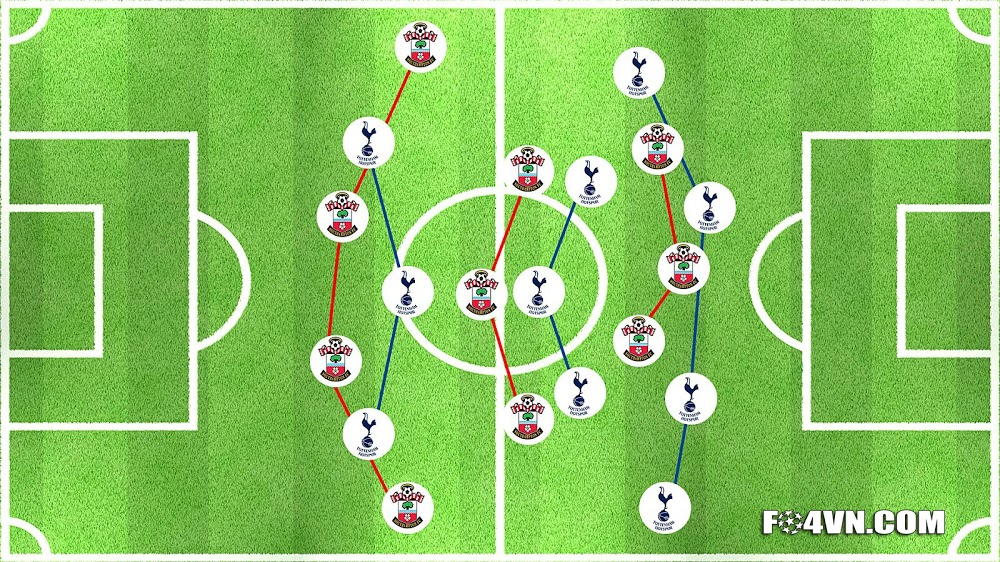 Đây là sơ đồ ra quân của 2 đội, khi cả 2 chơi ăn miếng trả miếng mà thực sự đã chứng minh. Đội nào tấn công tốt hơn, phòng thủ tốt hơn là đội chiến thắng. Nhưng mọi chuyện đều đến từ những thay đổi của Mourinho. Khi mà hiệp 1 TOT đã bị SOU cầm hòa và không tạo lên áp đảo trong lối chơi.