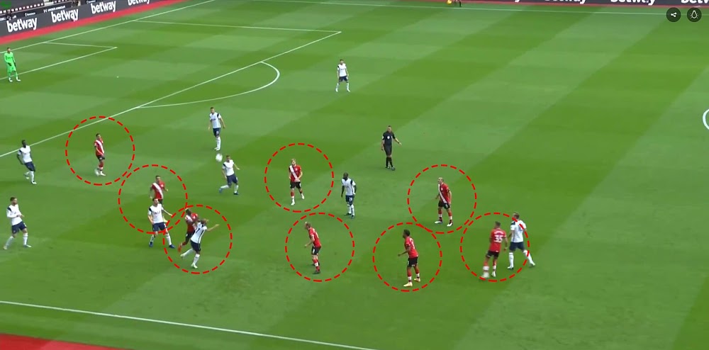 Nhìn vào bức hình trên, các bạn có thể thấy bên SOU đã chơi như thế nào trước các cầu thủ TOT. Luôn luôn áp đảo về số người, khống chế khoảng không. Điều này buộc Mourinho phải đưa ra một giải pháp để có thể triển khai lối chơi một cách thông thoáng hơn. Và ông đã chọn cách bố trí đội hình giăng ngang, với tuyến phòng thủ được phân tách rõ rệt