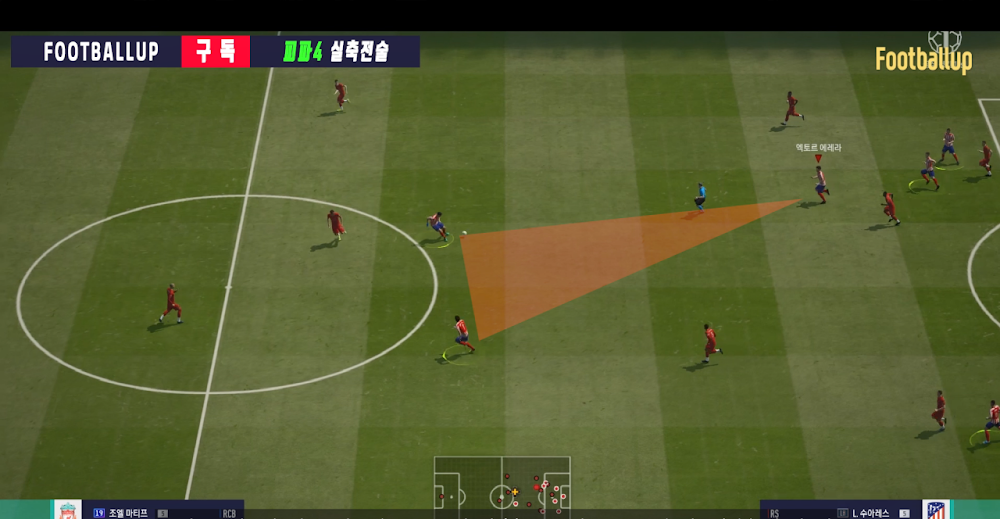 Trong hình trên, các bạn dễ nhận ra đội hình ATM hình thành nên một tam giác ở giữa sân, khi thường xuyên có một tiền vệ trao đổi bóng với 2 tiền đạo phía trên. Đặc biệt,khi Suarez đang xâm nhập từ phía sau, và Felix có một tình huống tấn công giả, hãy Q + S cho tiền vệ phía sau Suarez làm điểm xuất phát, và nếu tiền vệ này thực hiện đường chuyền S cho Felix , bước tiếp theo là một cú chọc khe Z + W hoặc W, hoặc QW và Suarez sẽ tìm thấy bạn.