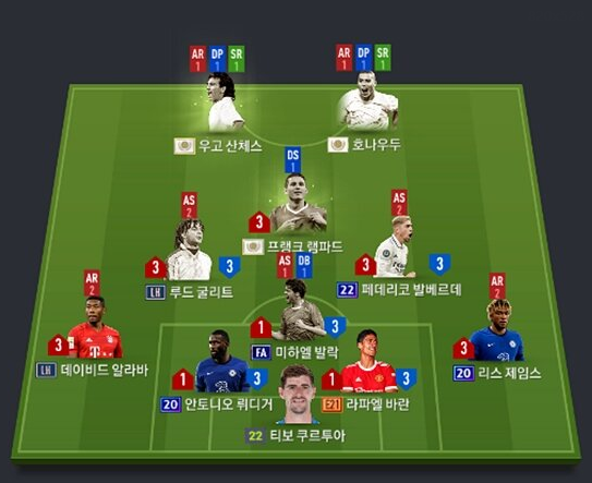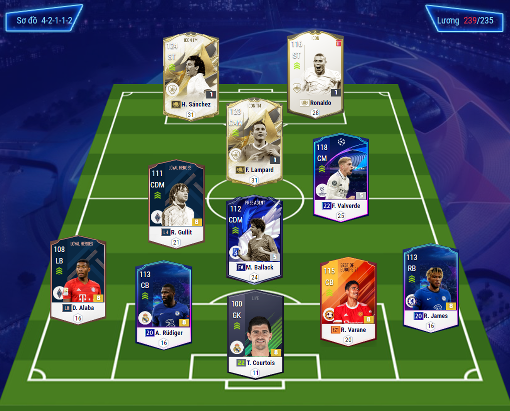 Khác với sever Việt Nam chúng ta, đa phần chơi theo kiểu team color thuần một CLB, thì ở Hàn Quốc họ rất chuộng những team kết hợp kiểu 515 ( tức là hai CLB mỗi bên có 5 cầu thủ và cầu thủ thứ 6 là giao thoa giữa hai CLB ). Như trên hình chúng ta có sự cân đối giữa hai cầu thủ là Rudiger và T. Courtois, cả hai đều có hai team color Chelsea và Real Madrid.