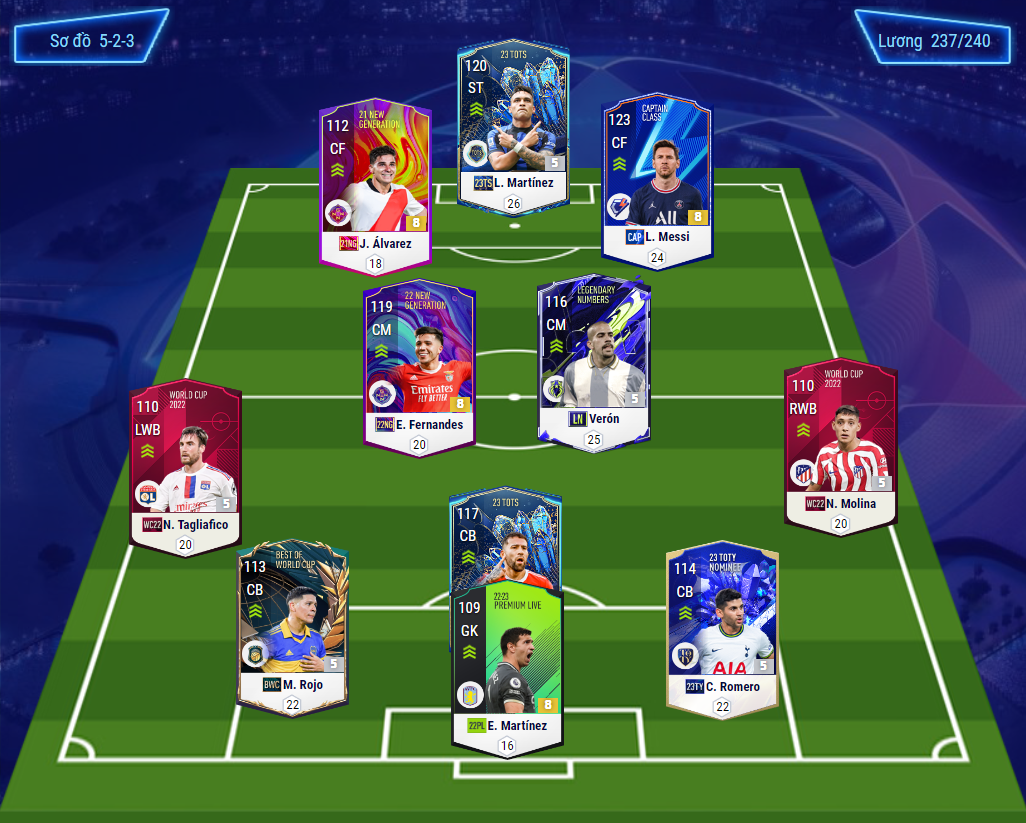 Ở hàng tiền vệ, Argentina chỉ có hai cái tên đá ổn là Enzo và Veron LN ( mùa ICON của Veron khá tệ ). Mascherano trong Fo4 không có đất diễn vì chiều cao và cân nặng quá thấp. Với chỉ có 2 cầu thủ đá tốt ở hàng tiền vệ thì nó thực sự phù hợp với 5-2-3 khi bạn sử dụng ít nhất hai cầu thủ tiền vệ với nhiệm vụ luân chuyển bóng là chính ( điều mà hai cầu thủ này làm rất tốt do có thánh chuyền bóng ).
