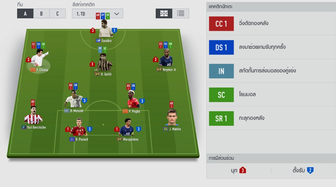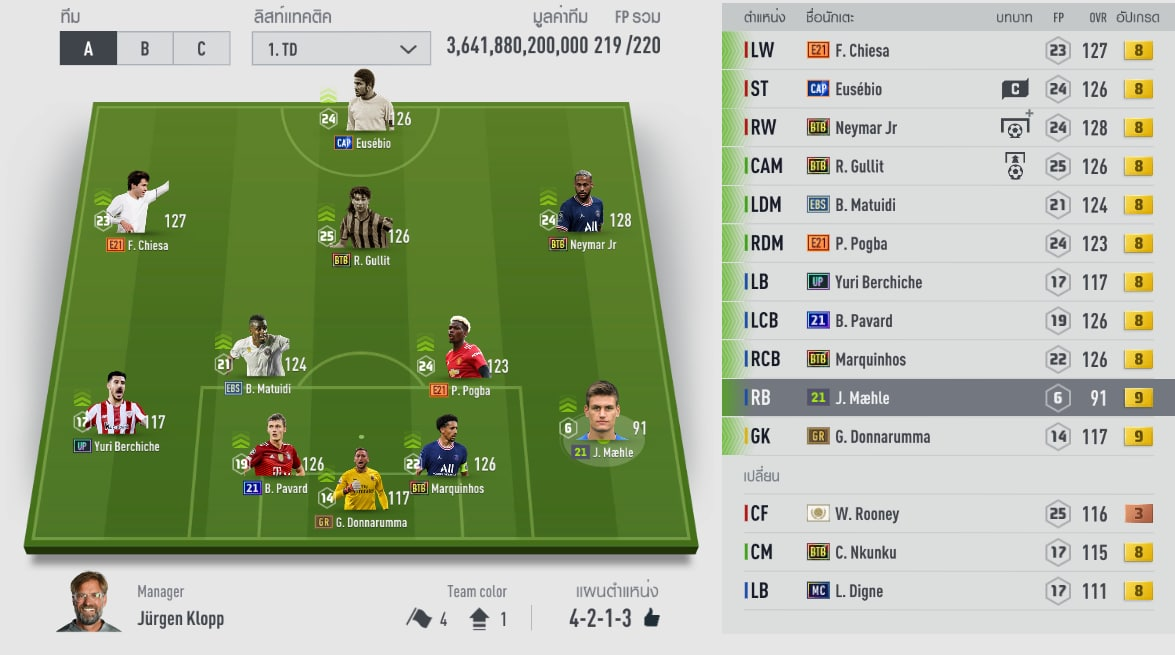 Vị trí thủ môn Donnarumma GR đã được chèn vào, đây cũng là một mùa mà Donnarumma bắt rất ảo diệu cũng như ổn định trong game. Đáng chú ý hiện HLV này đang dùng một CDM là Matuidi EBS + 8. Dễ dàng nhận ra đây chính là team color PSG trong game.