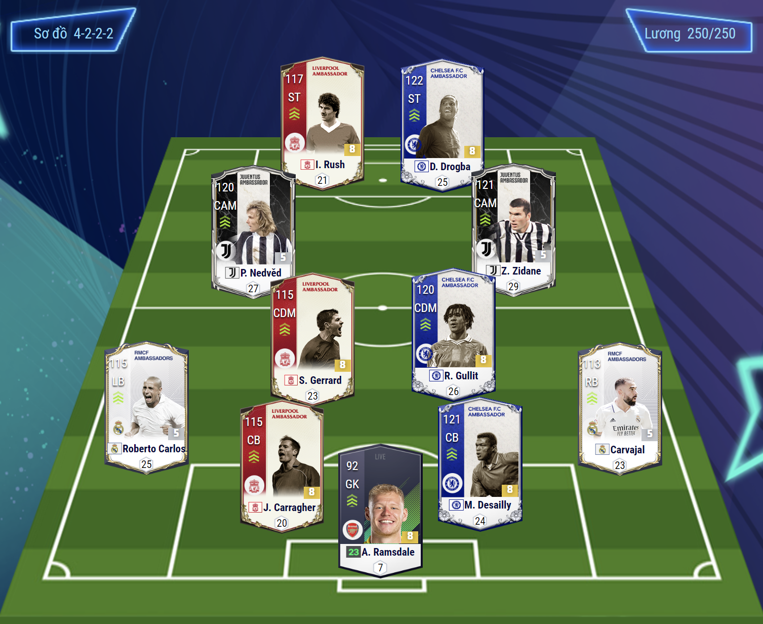 Trước tiên, sơ đồ được lựa chọn sẽ là dạng sơ đồ cực kì hợp meta thời điểm hiện tại đó là 4-2-2-2. Với 2 vị trí cao nhất trên hàng công được lựa chọn là Ian Rush và Drogba cộng 8 mùa Ambassador. 2 cầu thủ này là 2 tiền đạo cắm rất hay với Rush thiên về tốc độ, khả năng chạy chỗ còn Drogba thiên về sức mạnh, tì đè và khả năng không chiến.