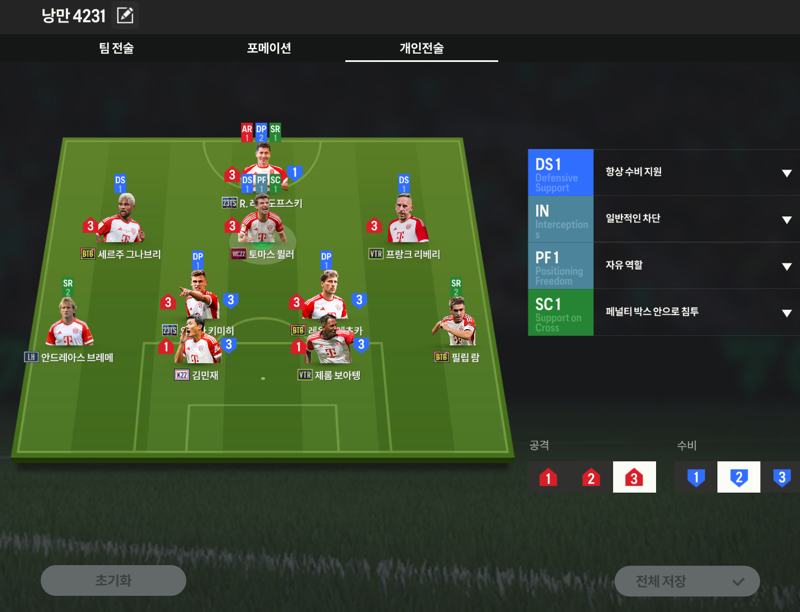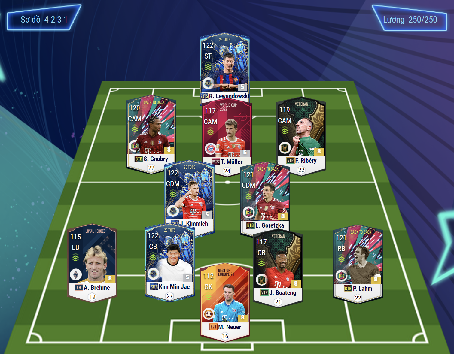 Sơ đồ chiến thuật được sắp xếp cơ bản và không có một biến tầu nào ở các vị trí. Điểm mạnh của sơ đồ này là ở cách lựa chọn cầu thủ. Tiền đạo cắm không ai khác chính là cái tên quen thuộc và hay bậc nhất game hiện tại Lewandowski 23TS. Bộ 3 tiền vệ công lần lượt là Gnabry, Muller và Ribery. Tiền vệ công giữa CAM lựa chọn Muller vừa có tỉ lệ kiến tạo thành bàn cao vừa có khả năng ghi bàn tốt. Trong khi đó 2 tiền vệ công lệch trái phải lựa chọn 2 cầu thủ chạy cánh có tốc độ và khả năng chuyền tạt tốt.