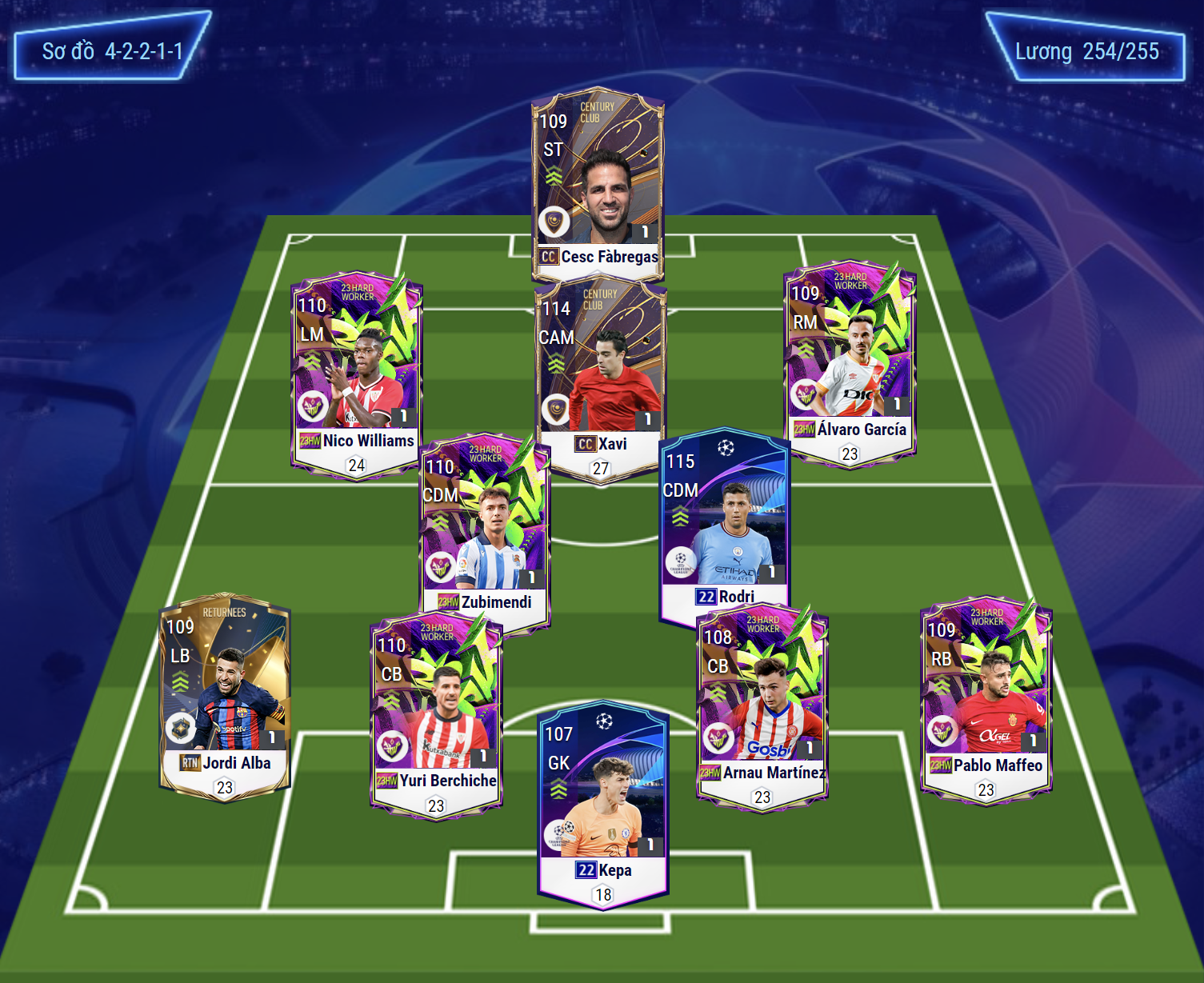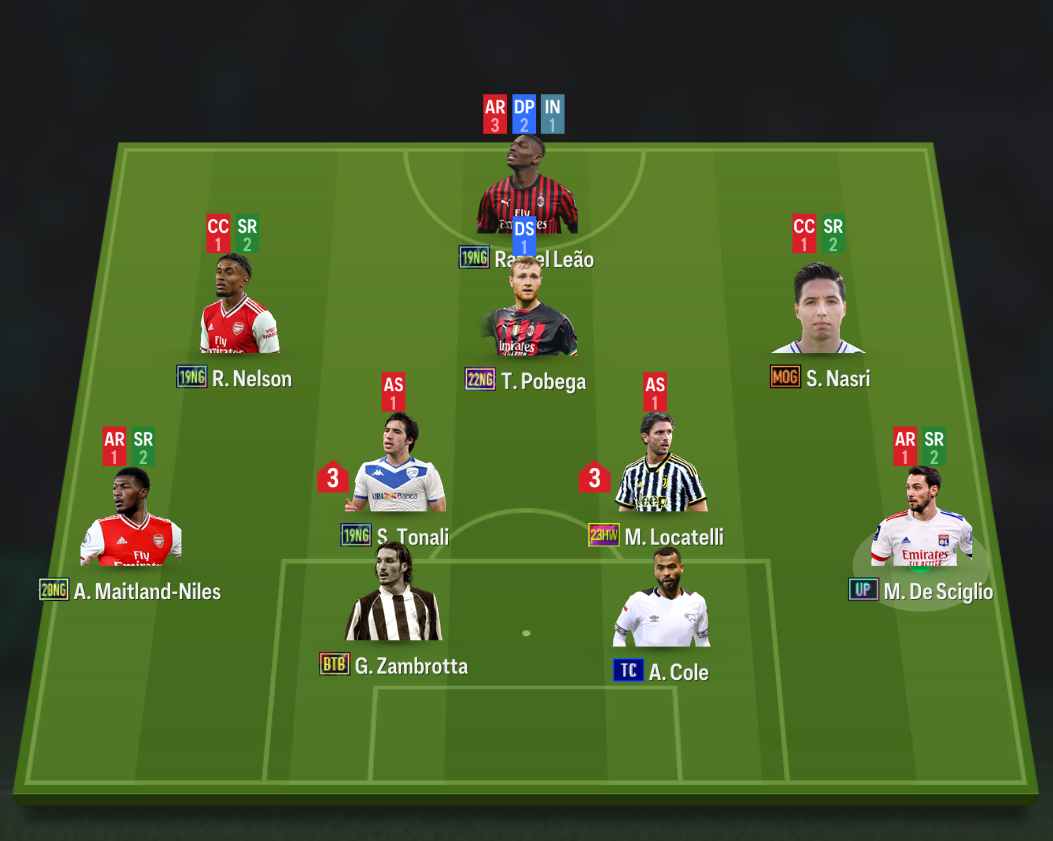 Sơ đồ được lựa chọn là sơ đồ 42211 với vị trí tiền đạo là Fabregas. Tiền vệ công CAM là sự xuất hiện của Xavi. Bộ đôi tiền vệ cánh được lựa chọn là Williams và Garcia của mùa 23HW.