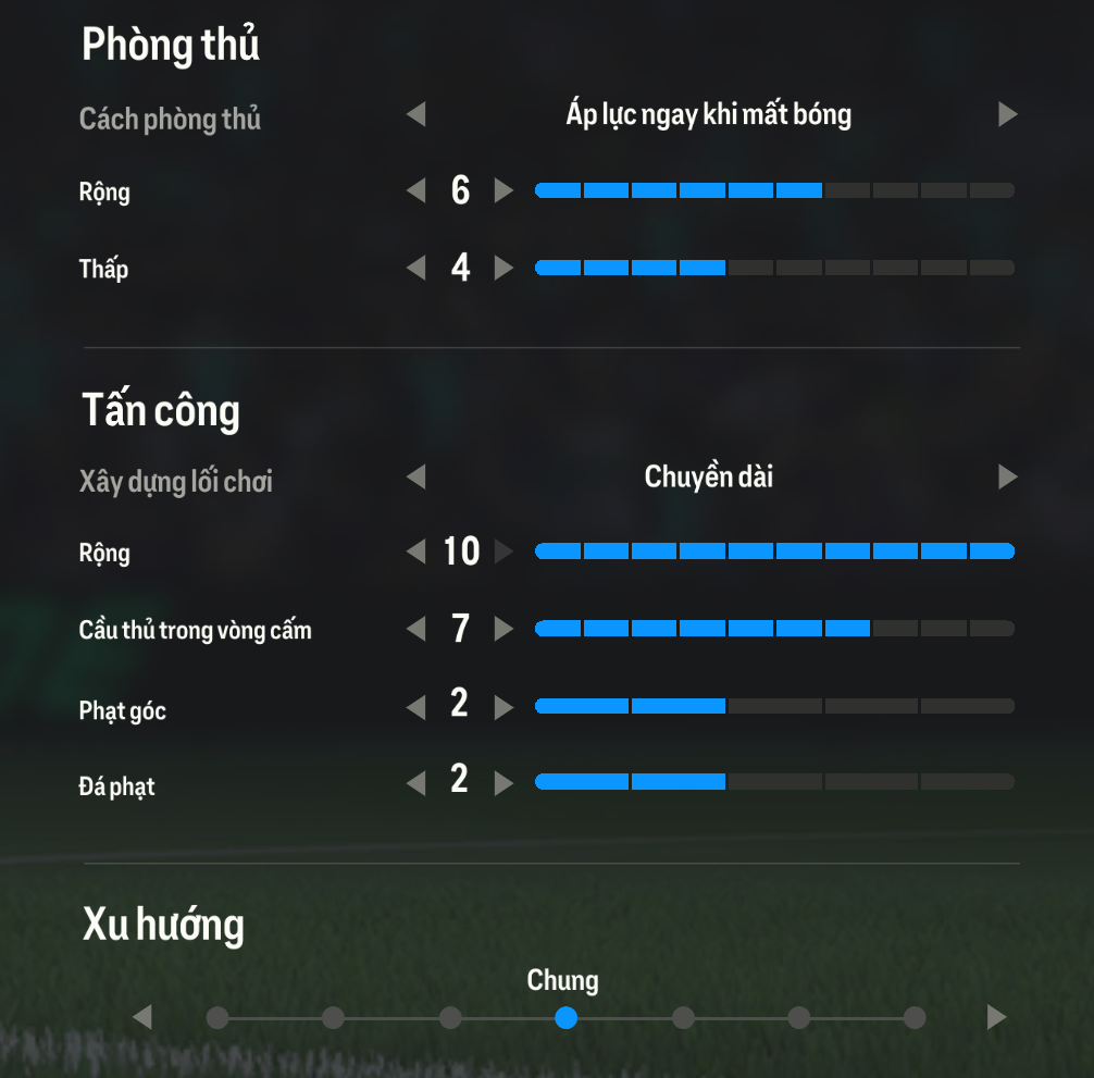Trong khi đó tấn công với lối chơi chuyền dài sẽ thúc đẩy đội hình lên một cách hiệu quả bằng việc dâng lên của hàng công để đón những đường phất bóng. Xu hướng dâng 10 sẽ giúp kéo đội hình lên nhanh chóng để triển khai tấn công và dồn ép đối thủ.