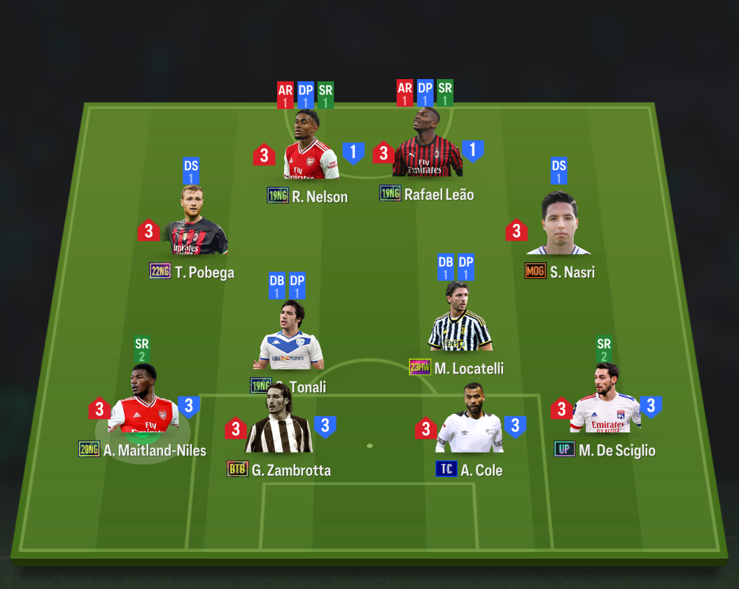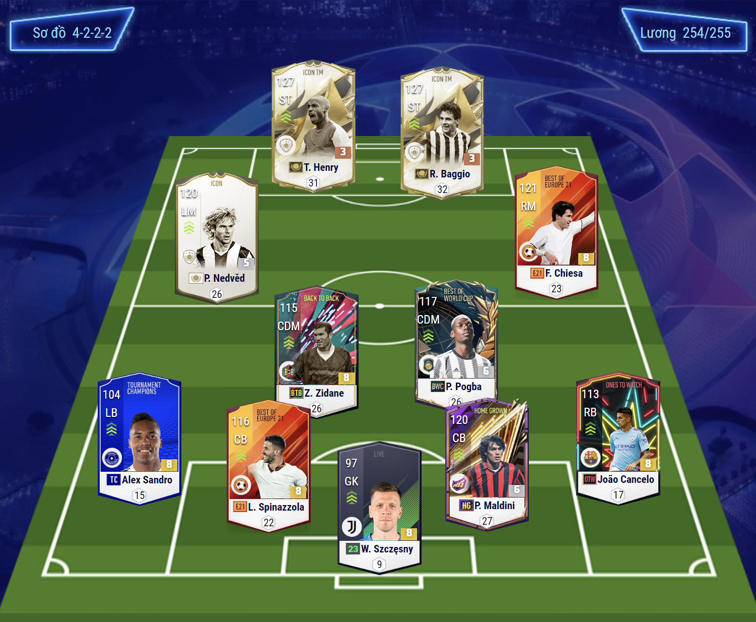 Tiền vệ trung tâm là sự góp mặt của Zidane và Pogba. Trong khi đó 2 hậu vệ biên là Alex Sandro và Cancelo. Cặp trung vệ với Spinazzola và cầu thủ mượn Maldini. Đây sẽ là cặp trung vệ ý sở hữu tốc độ và khả năng đánh chặn cực tốt. Thủ môn Szczesny là cái tên được chọn trong khung gỗ.