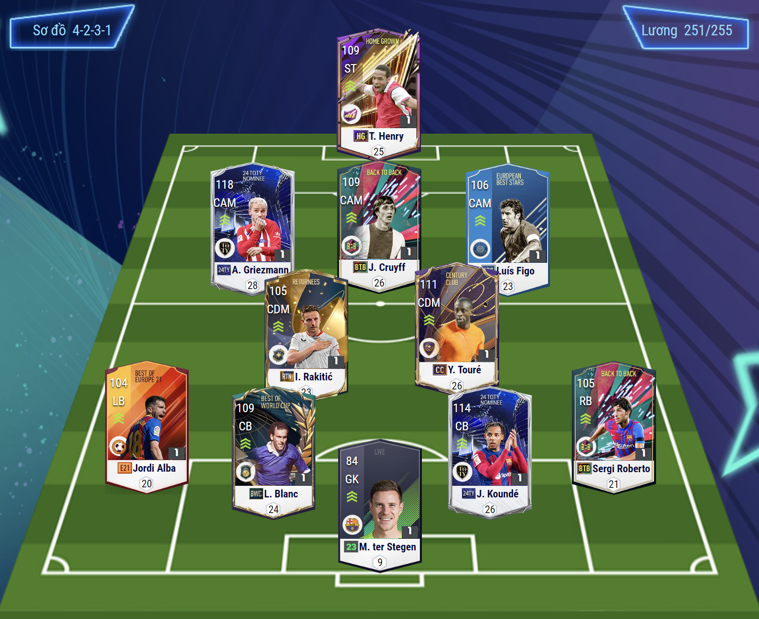 Sơ đồ 4231 được thiết lập cơ bản và không có những biến tấu nào trong các vị trí thi đấu. Vai trò tiền đạo cắm là sự xuất hiện của Henry, cầu thủ sở hữu tốc độ và kỹ năng ghi bàn sắc bén. Bộ 3 tiền vệ công sẽ gồm Figo, Cruyff và Griezmann, một trong những cái tên đáng giá mùa 24TY thời điểm hiện tại.