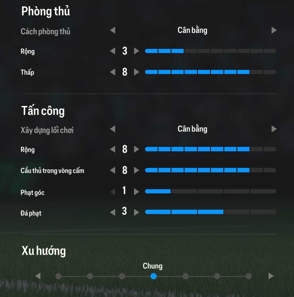 Phòng ngự cân bằng với độ rộng 3 và độ thấp 8 sẽ giúp đội hình dâng cao, bắt người và đánh chặn từ sớm các đường triển khai bóng và tránh việc bị phản công. Trong khi đó độ rộng cài thấp sẽ kéo các cầu thủ bó vào trung lộ nhiều hơn, hạn chế được khả năng phối hợp và sút xa ở khu vực trước khung thành.