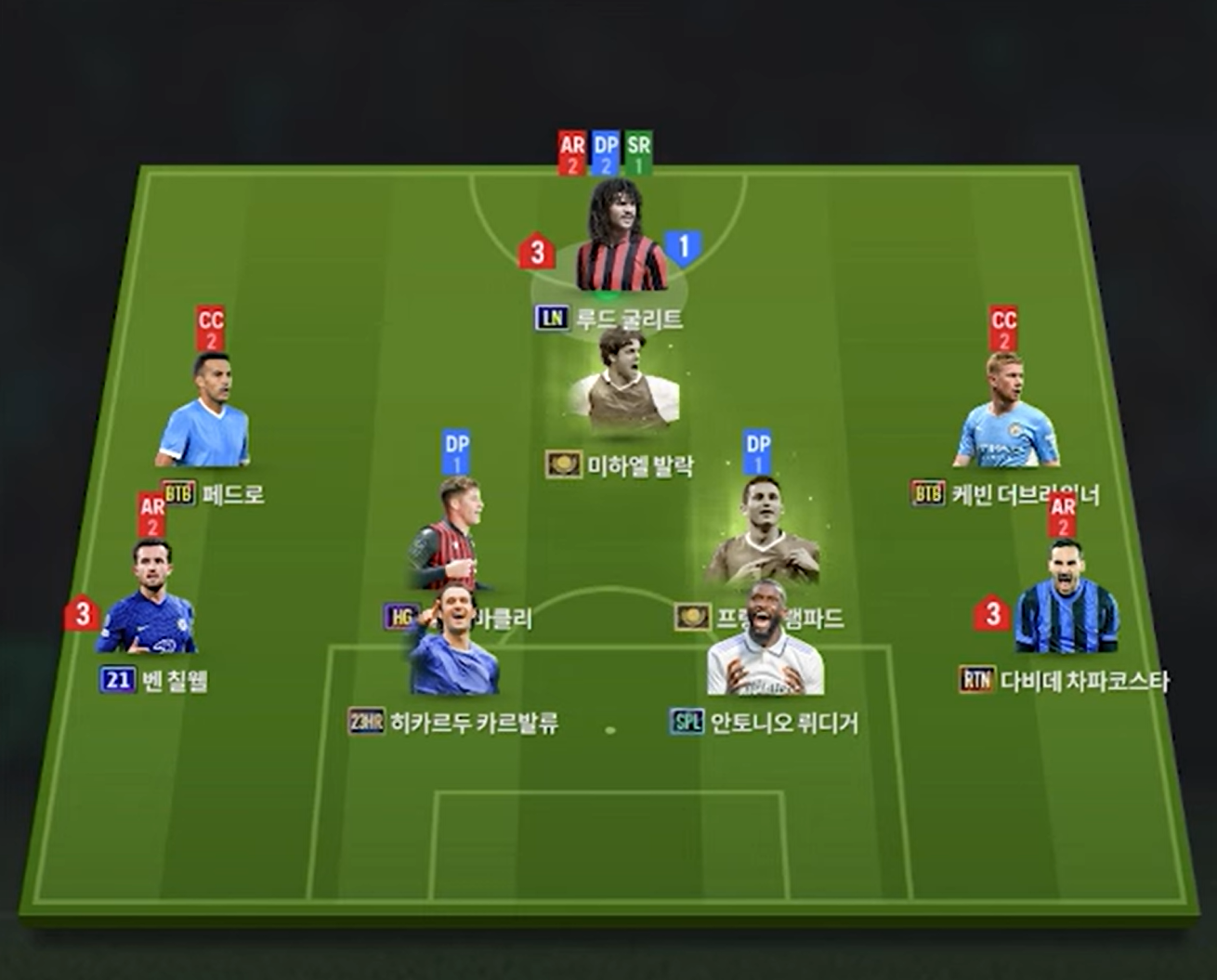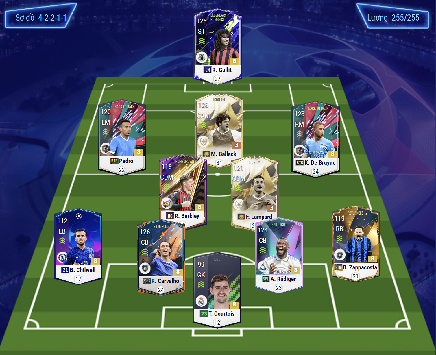 Sơ đồ 42211 được thiết lập cực kì cơ bản, không có biến tấu nào quá rõ net. Trong đó, chơi cao nhất trên hàng công chính là Gullit với bộ chỉ số toàn diện cho khả năng tấn công. Trong khi đó tiền vệ công hỗ trợ trực tiếp cho Gullit sẽ là Ballack, một con quái vật với thể hình tốt, chuyền hiệu quả, sút xa hay. Cặp đôi chạy cánh Pedro và De Bruyne là 2 cái tên được tin dùng.