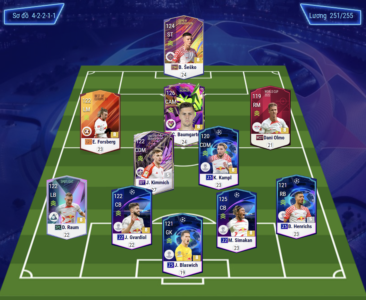 Sơ đồ 42211 được xem là dạng sơ đồ cực kì cơ bản và hiệu quả với cầu thủ chơi cao nhất trên hàng công là Sesko. Hỗ trợ cho anh là Baumgartner. Cặp đôi tiền vệ cánh được lựa chọn là Forsberg và Dani Olmo.