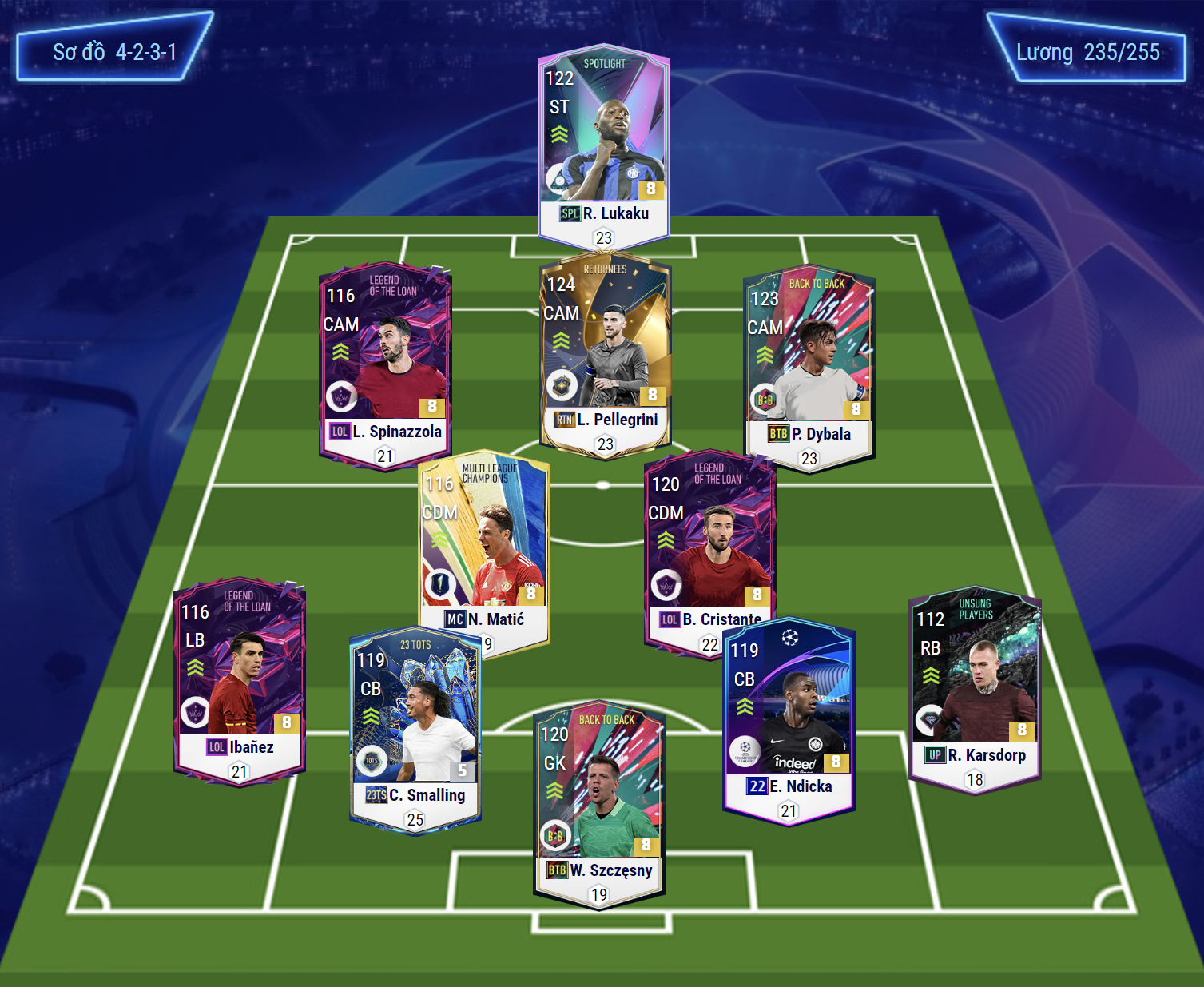 Sơ đồ được lựa chọn là 4231 cơ bản, với AS Roma, tiền đạo cắm được tin dùng là Lukaku. Cầu thủ sở hữu tốc độ, sức mạnh cùng khả năng dứt điểm nhạy bén. Bộ 3 tiền vệ công hỗ trợ cho Lukaku bao gồm Spinazzola, Dybala và Pellegrini.