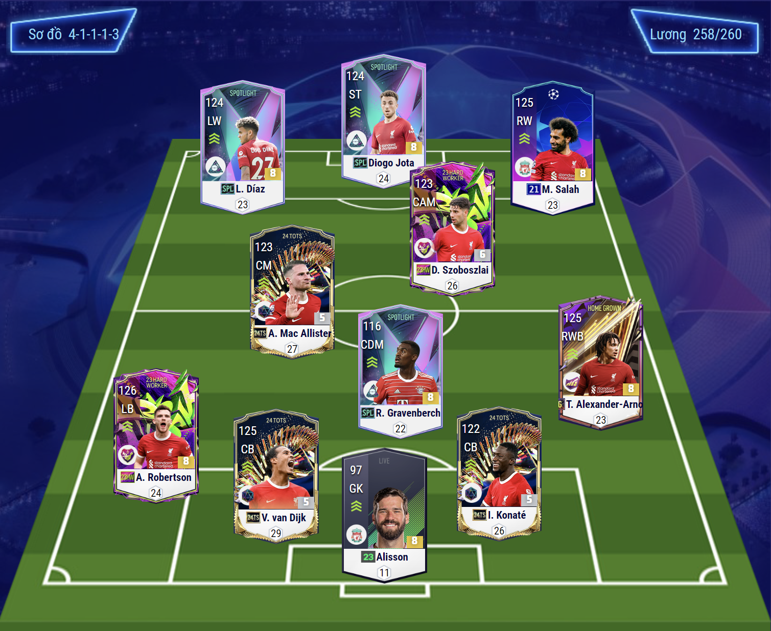 Trong FC Online, Liverpool đương đại cũng rất mạnh với nhiều cái tên sáng giá như Salah, Diaz, Szoboszlai, Van Dijk, Arnold, Konate... Họ đều là những cái tên mà các HLV dễ dàng sở hữu.