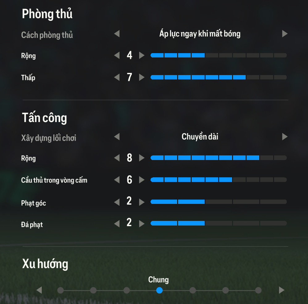 Chiến thuật đơn được thiết lập như hình để tối ưu khả năng chơi bóng của từng cầu thủ.