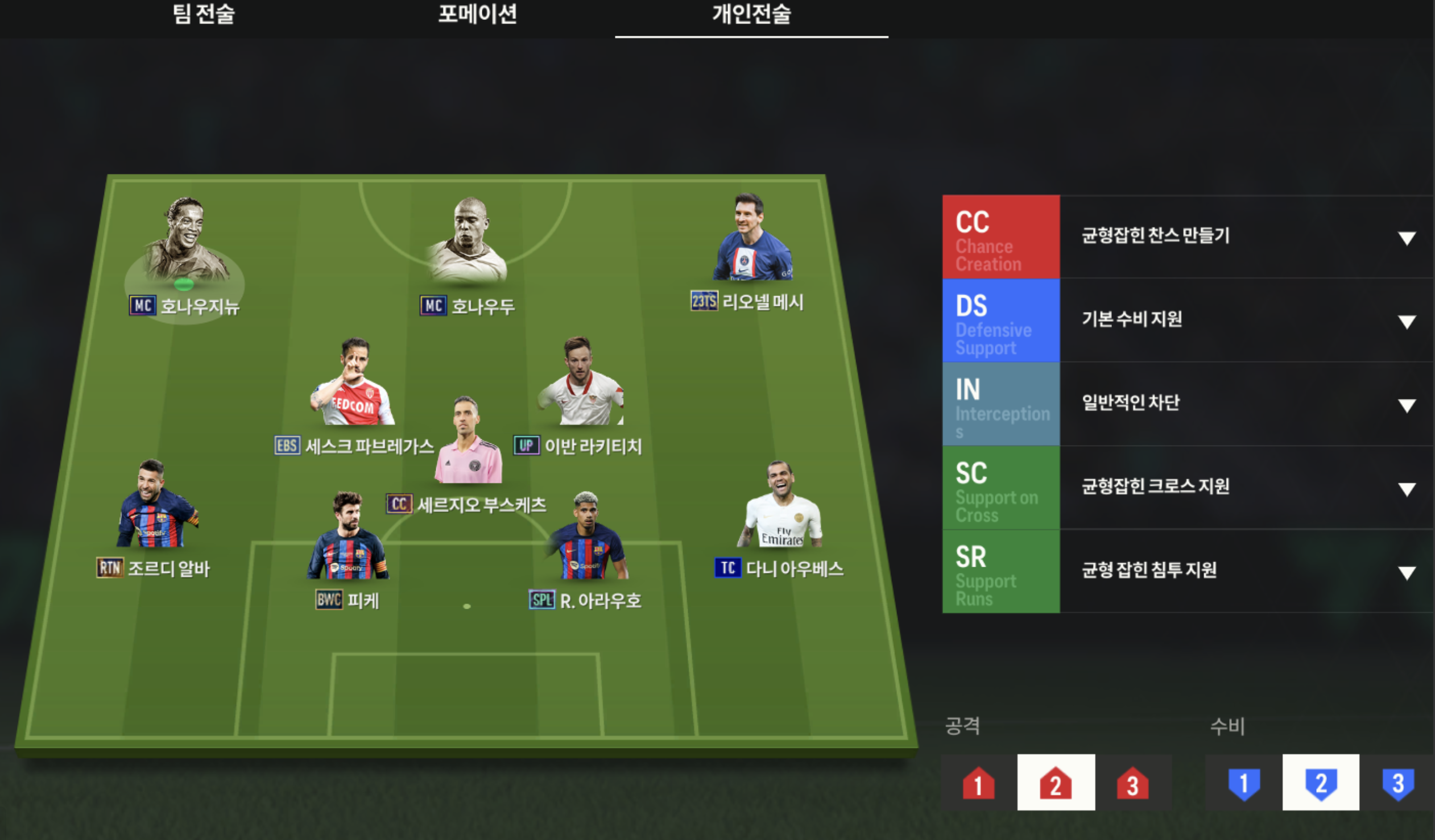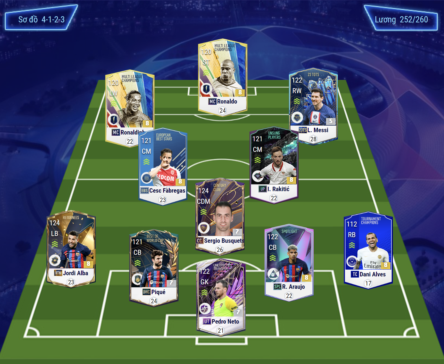 Với sơ đồ 4123, bộ 3 trên hàng công lần lượt sẽ là Ronaldo ở vai trò tiền đạo cắm, Ronaldinho và Messi sẽ đảm nhiệm 2 bên hành lang. Cặp tiền vệ trung tâm với Fabregas và Rakitic. Đây đều là những cầu thủ có khả năng chuyền bóng, phối hợp và sút xa cực kì hay.