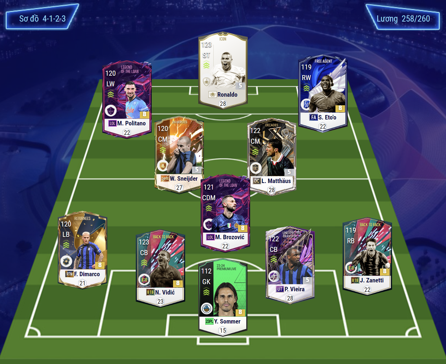 Trong FC Online, team color Inter Milan có rất nhiều những cái tên sáng giá, nổi bật và đem lại hiệu quả sử dụng cao cũng như leo rank ấn tượng. Đó là lí do game thủ Kim Yoo Min đã xây dựng và vận hành một đội hình Inter Milan leo rank cực kì hiệu quả với sơ đồ 4123