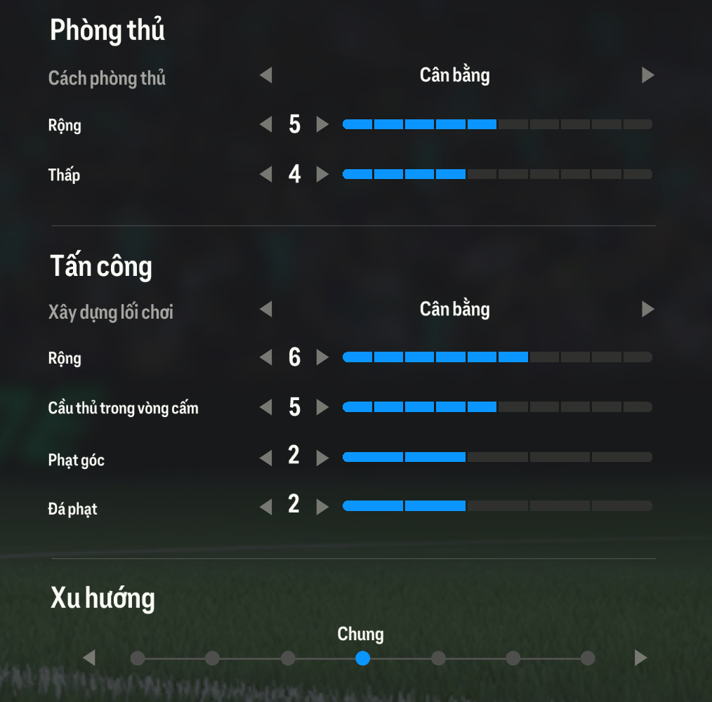 Trong khi đó, tấn công cân bằng cùng xu hướng 6-5 sẽ giúp đội hình dâng lên ở mức ổn, không quá nhanh và ưu tiên kiểm soát tuyến giữa nhằm tạo ra lợi thế trong các tình huống ban bật và tạo ra nhiều cơ hội ghi bàn.