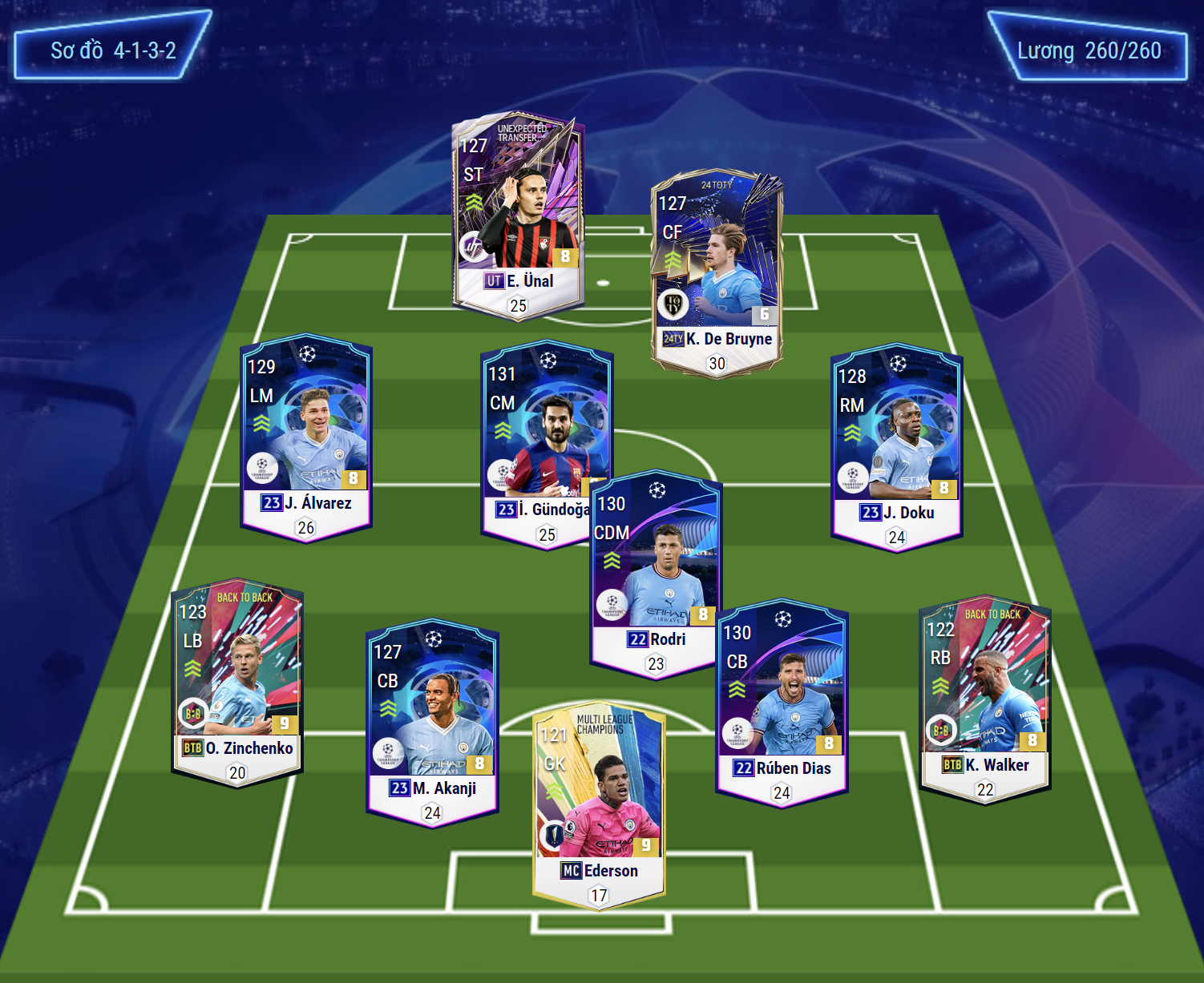 Sơ đồ 4132 được lựa chọn với vị trí chơi cao nhất trên hàng công là vị trí LS với Unal. Hộ công cho anh là De Bruyne chơi ở vai trò RF. Cặp tiền vệ cánh được lựa chọn là Alvarez và Doku ở 2 bên hành lang cánh. Vị trí tiền vệ trung tâm CM được tin dùng là Gundogan.