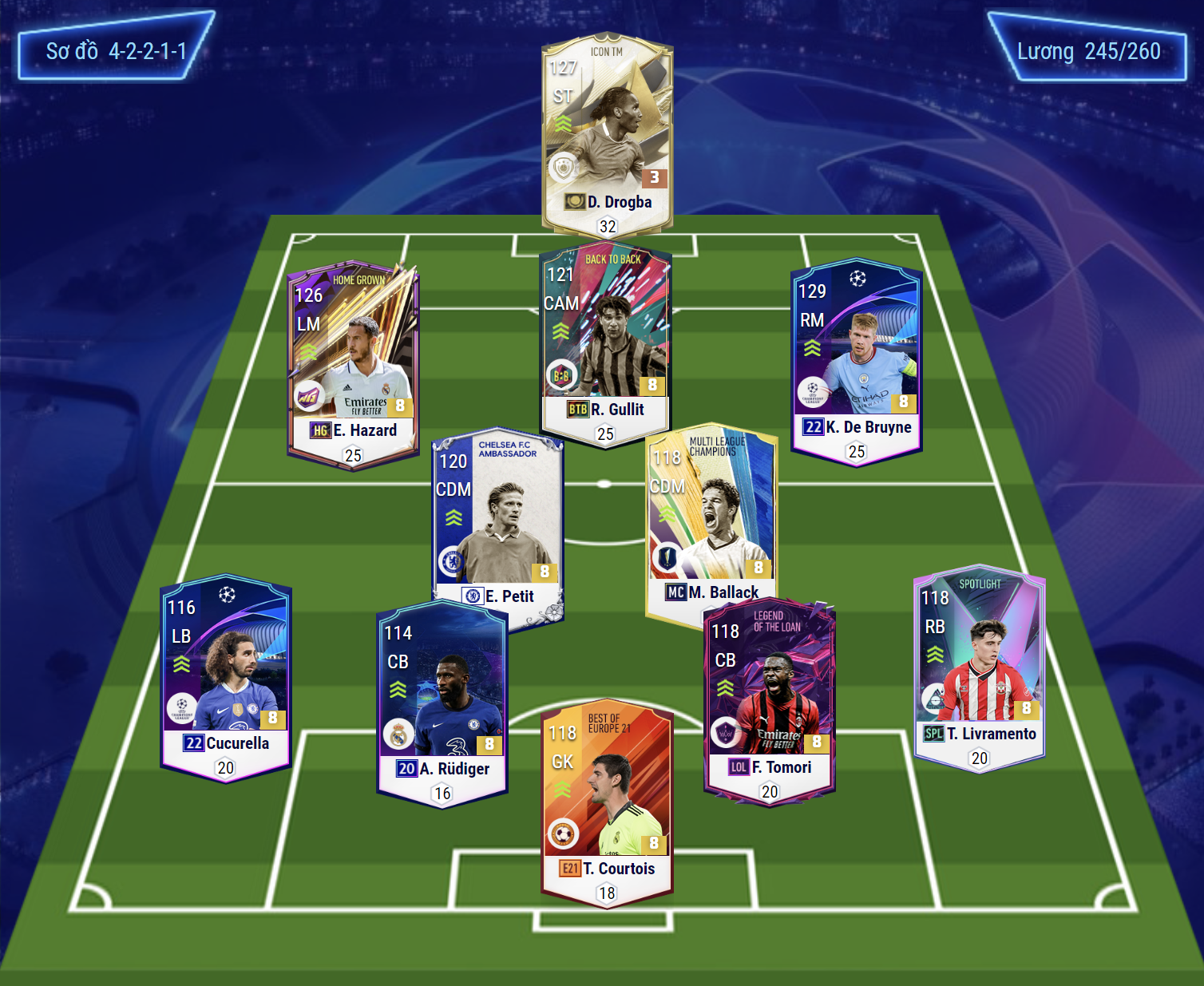 Vị trí tiền vệ trung tâm được lựa chọn là Petit và Ballack. Bộ đôi hậu vệ biên Cucurella và Livramento hiện đang được đánh giá rất cao về độ hợp meta. Trong khi đó Rudiger và Tomori là cặp trung vệ được tin dùng. Courtois là cái tên khó có thể thay thế trong khung gỗ.