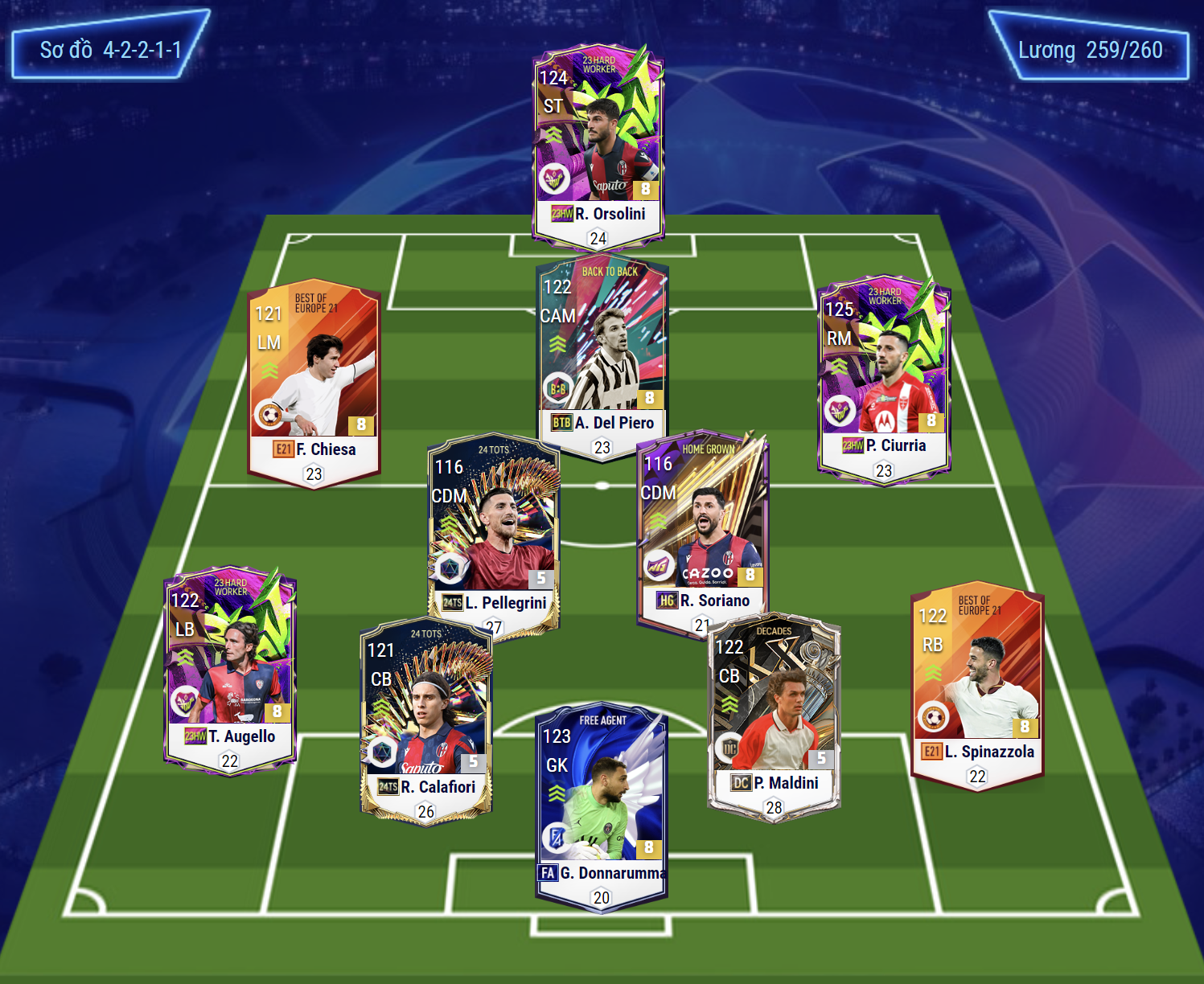 Sơ đồ 42211 với cầu thủ chơi cao nhất trên hàng công là Orsolini, trong đó tiền vệ công của sơ đồ được đặt cho Del Piero. Cả 2 đều sở hữu kỹ năng dứt điểm, chuyền bóng và xử lý bóng cực kì tốt. Cặp đôi tiền vệ cánh lần lượt là Chiesa và Ciurria.