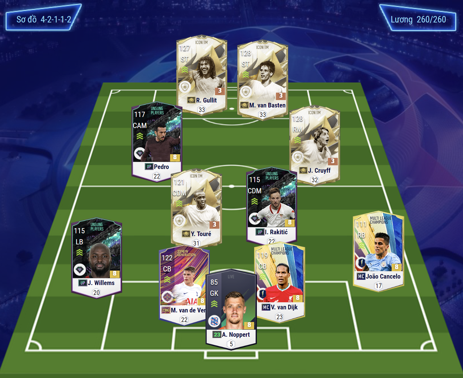 Cặp đôi tiền vệ phòng ngự là sự xuất hiện của Yaya Toure và Rakitic, 2 cầu thủ vừa mạnh ở khả năng chuyền bóng vừa sút xa rất hiệu quả. Bộ tứ vệ với Willems và Cancelo ở hành lang cánh trong khi đó cặp trung vệ Van Dijk và Van de Ven sẽ án ngữ ở vị trí trung vệ bảo vệ khung thành của Noppert.