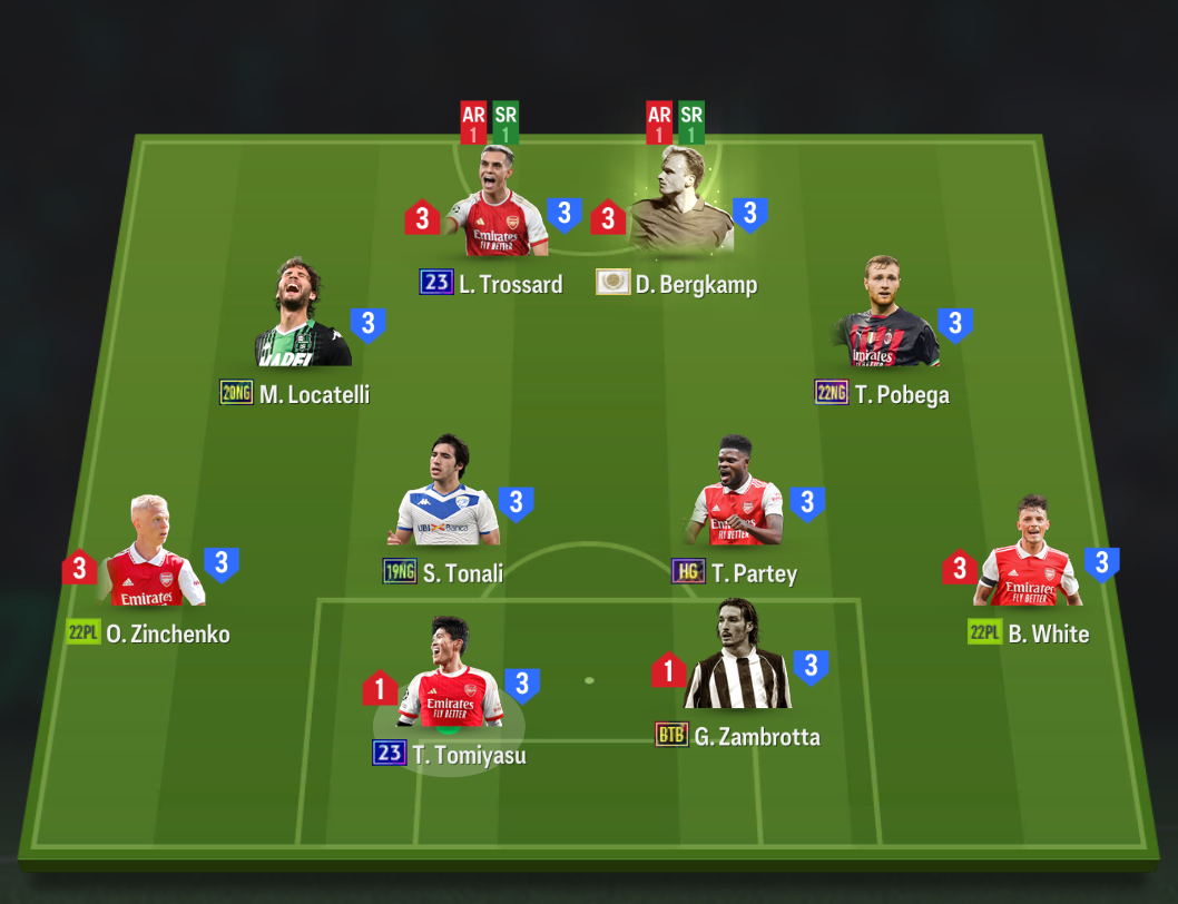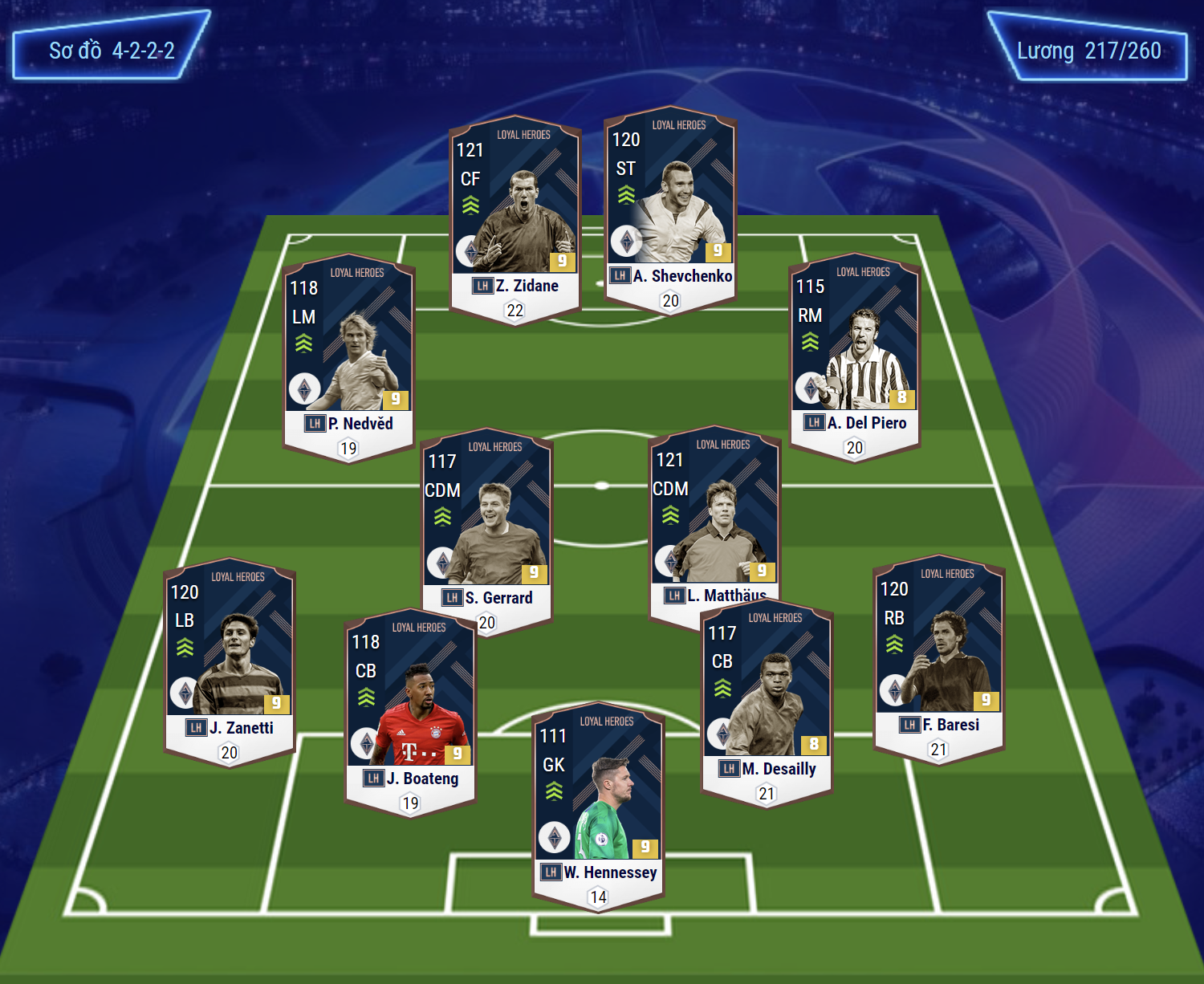 Sơ đồ 4222 với bộ đôi tiền đạo cắm được tin dùng là Zidane và Shevchenko. Cả 2 đều có kỹ năng dứt điểm toàn diện và khả năng không chiến ở mức đủ dùng. Cặp đôi tiền vệ cánh Nedved và Del Piero khá đa năng khi vừa có thể sút tốt vừa chuyền bóng, tạt bóng HIỆU QUẢ.